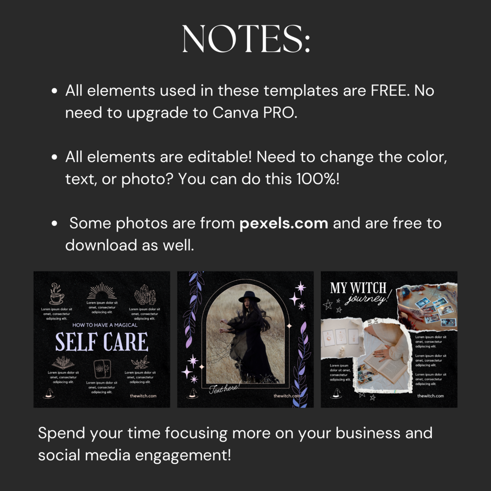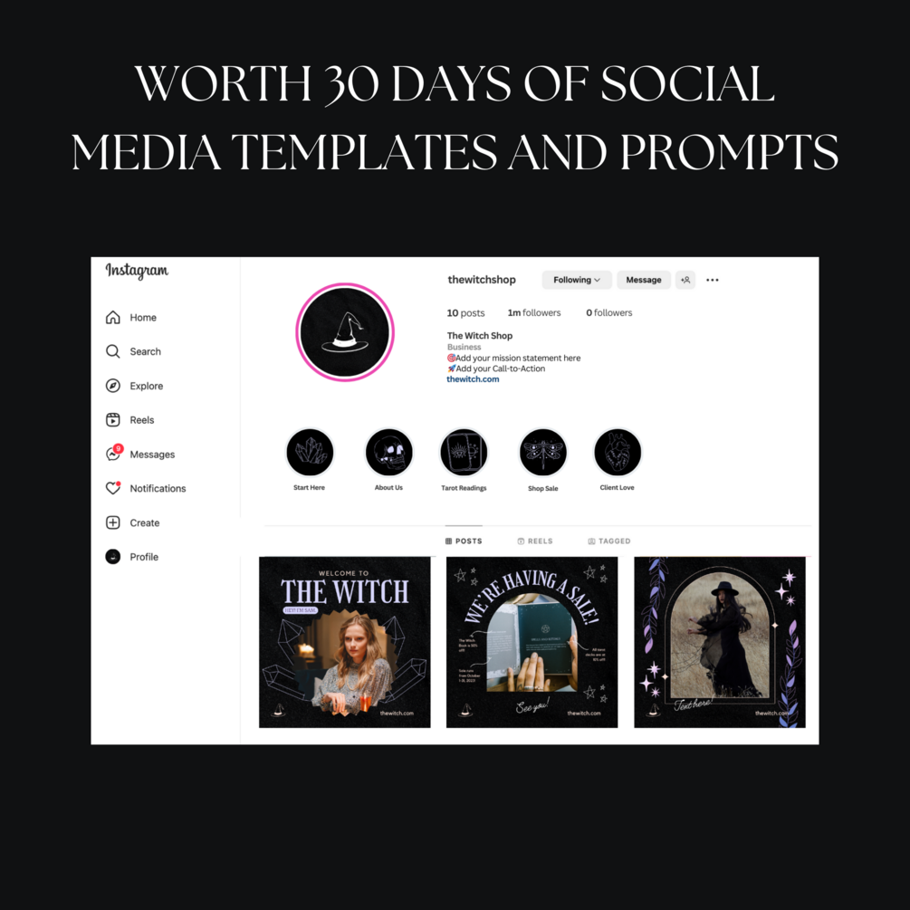 You'll get 30 days worth of mystical themed editable black mystical magic witch social media templates for Instagram and Facebook!