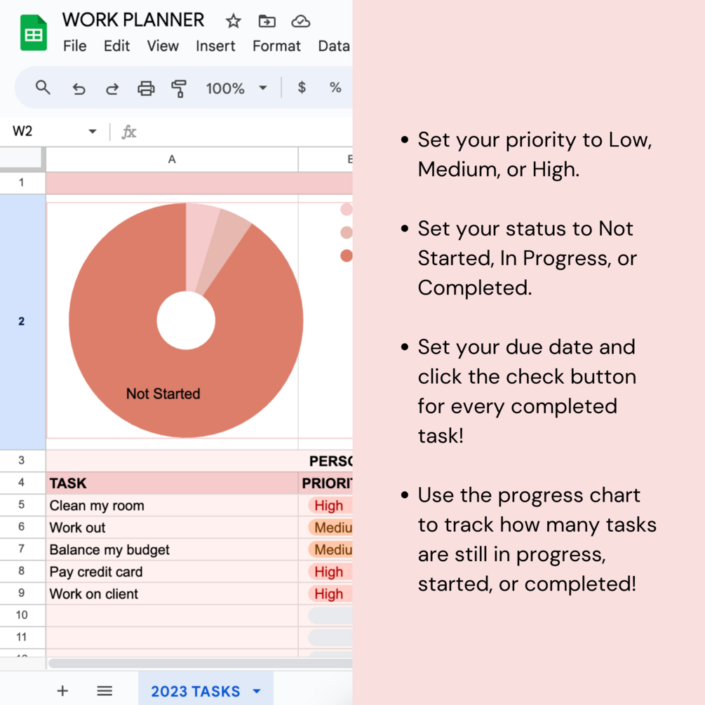 Our carefully designed work planner Google Sheet template is more than just a tool; it's a productivity companion aimed to seamlessly track your tasks, monitor progress with a chart, and set priorities and statuses that align with your workflow.